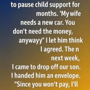 My ex called one day and asked if he could put child support on hold for a few months. “My wife needs a new car,” he said….