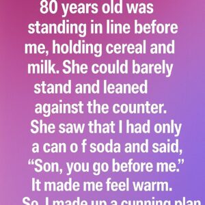 An old lady of about 80 years old was standing in line before me, holding cereal and milk. She could barely stand and leaned against the counter….