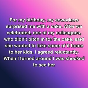For my birthday, my coworkers surprised me with a cake. After we celebrated, one of my colleagues, who didn’t pitch in for the cake, said she wanted…