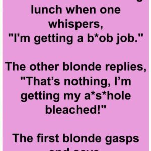 She Said WHAT at Lunch?! Two blondes are having lunch when one whispers, “I’m getting a boob job.” The other blonde replies, “That’s nothing, I’m getting my…