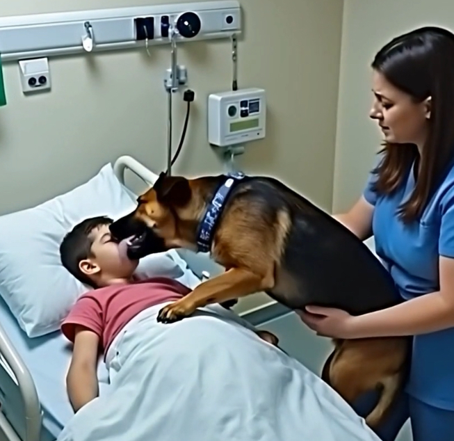 Shadow wasn’t barking. He wasn’t whining. He simply stood there, front paws on the mattress, nose pressed gently against Lucas’s cheek, breathing in slow, steady rhythm with the boy.